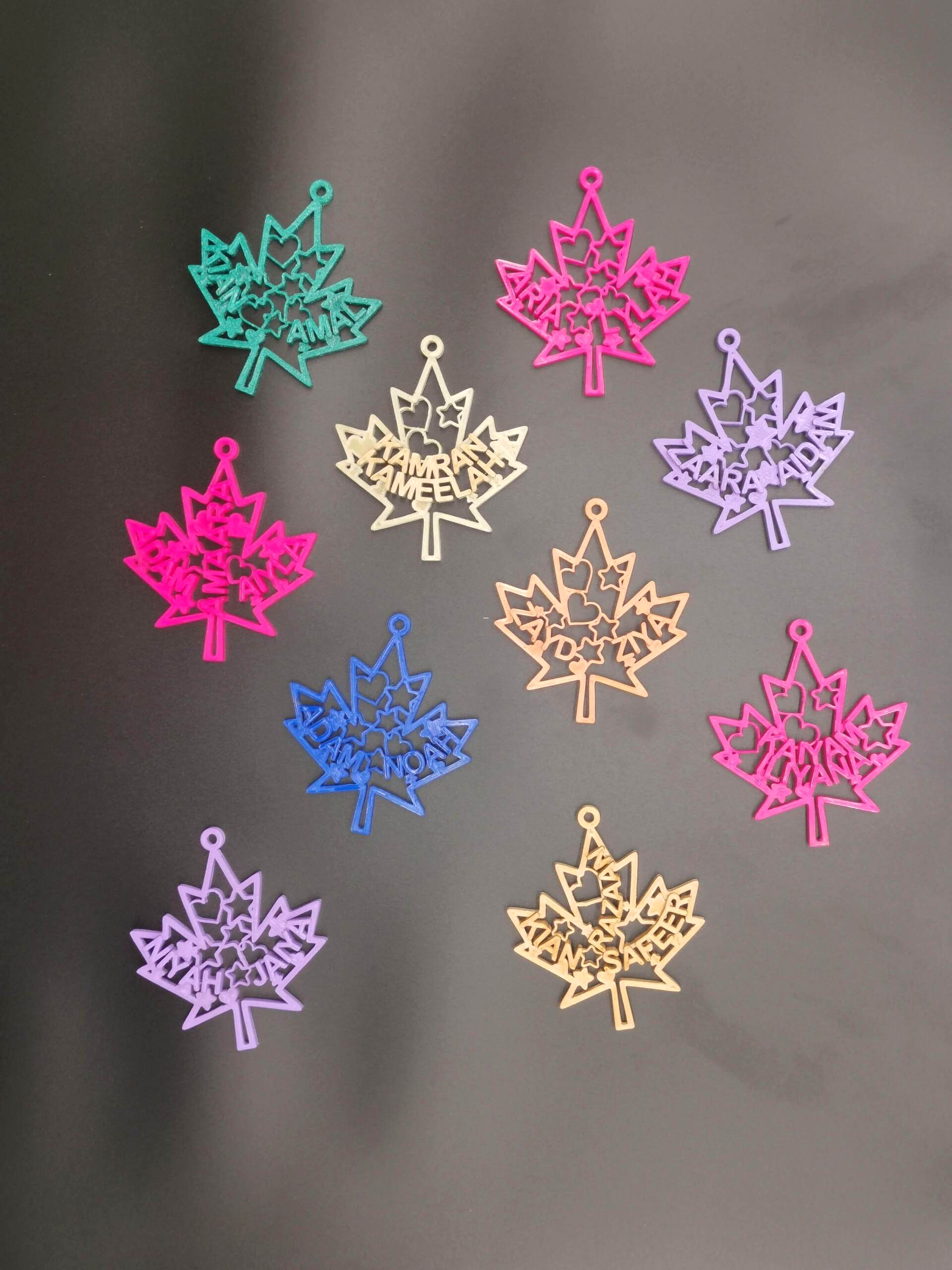 Setting: Newly designed personalised decorations, these are perfect for engagement or wedding gifts, birthday / Christmas presents, or hanging on a Christmas tree or around the home. Available to order in 'leaf' and 'heart' designs and in a wide range of colours.