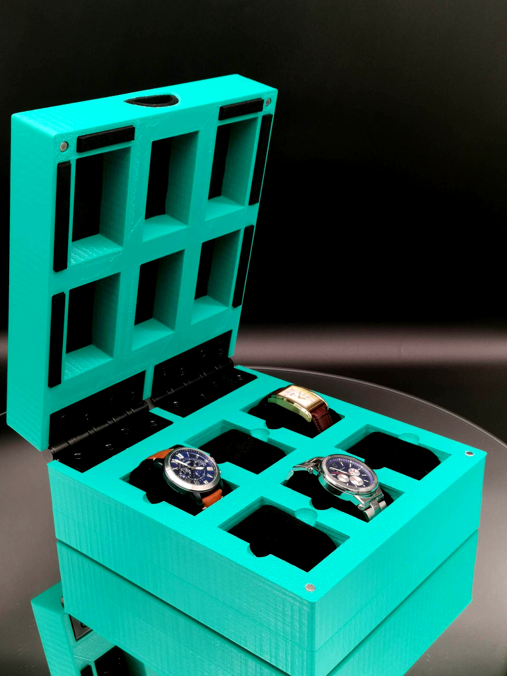 Setting: This six piece watch box was designed and built for a customer that wanted a specific product that they could not find on the market. We worked with them to bring their vision to life, from design to build. Created in a unique mint green colour, we embossed their logo on the lid and incorporated luxury finishes such as velvet strap support cushions.