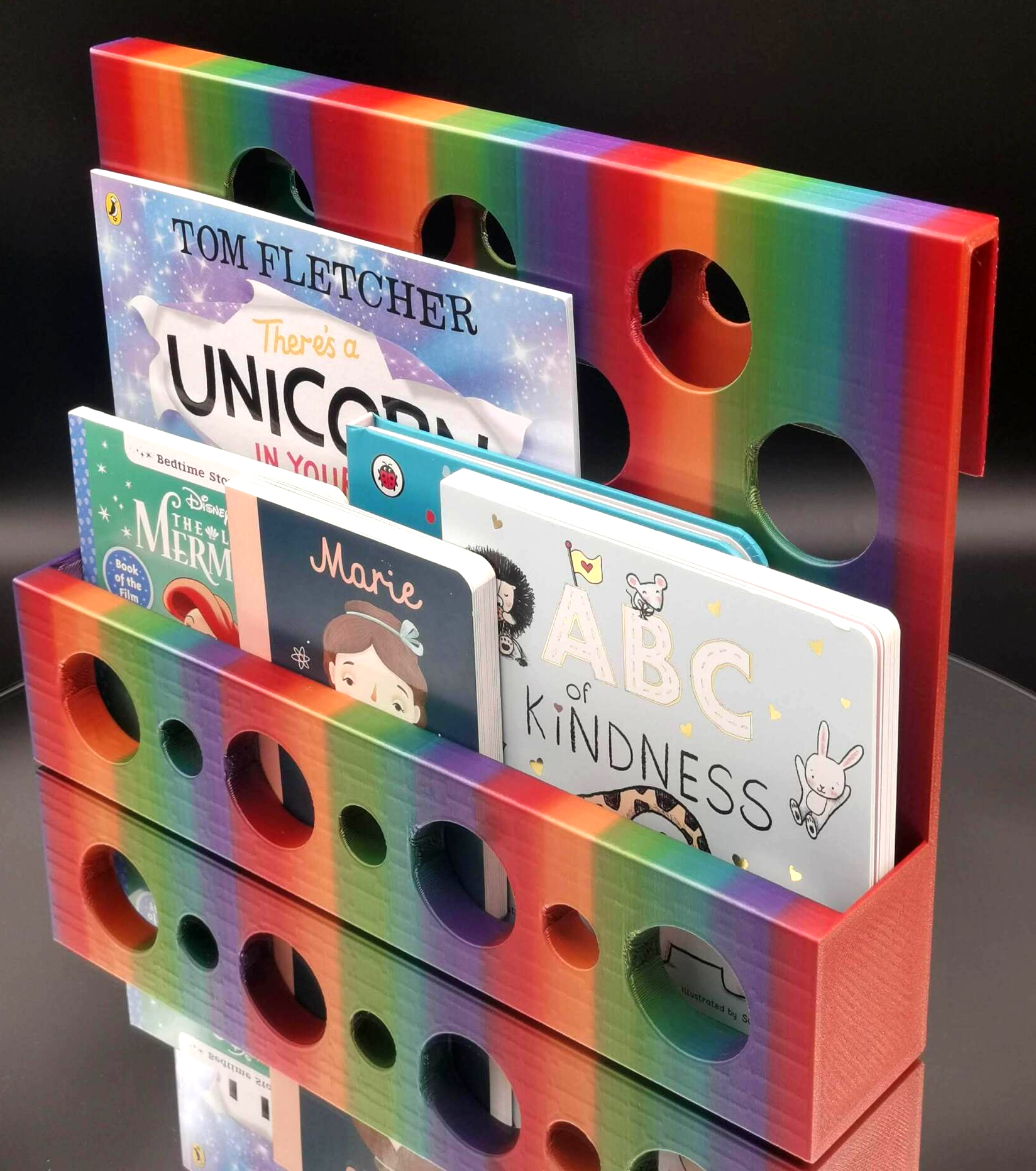 Setting: A custom bookcase created to exact specifications and in a bright, colourful rainbow print, this bookshelf is perfect for a little girl's bedroom. As your baby's book collection grows, add to your storage by slotting more of these bookshelves together.