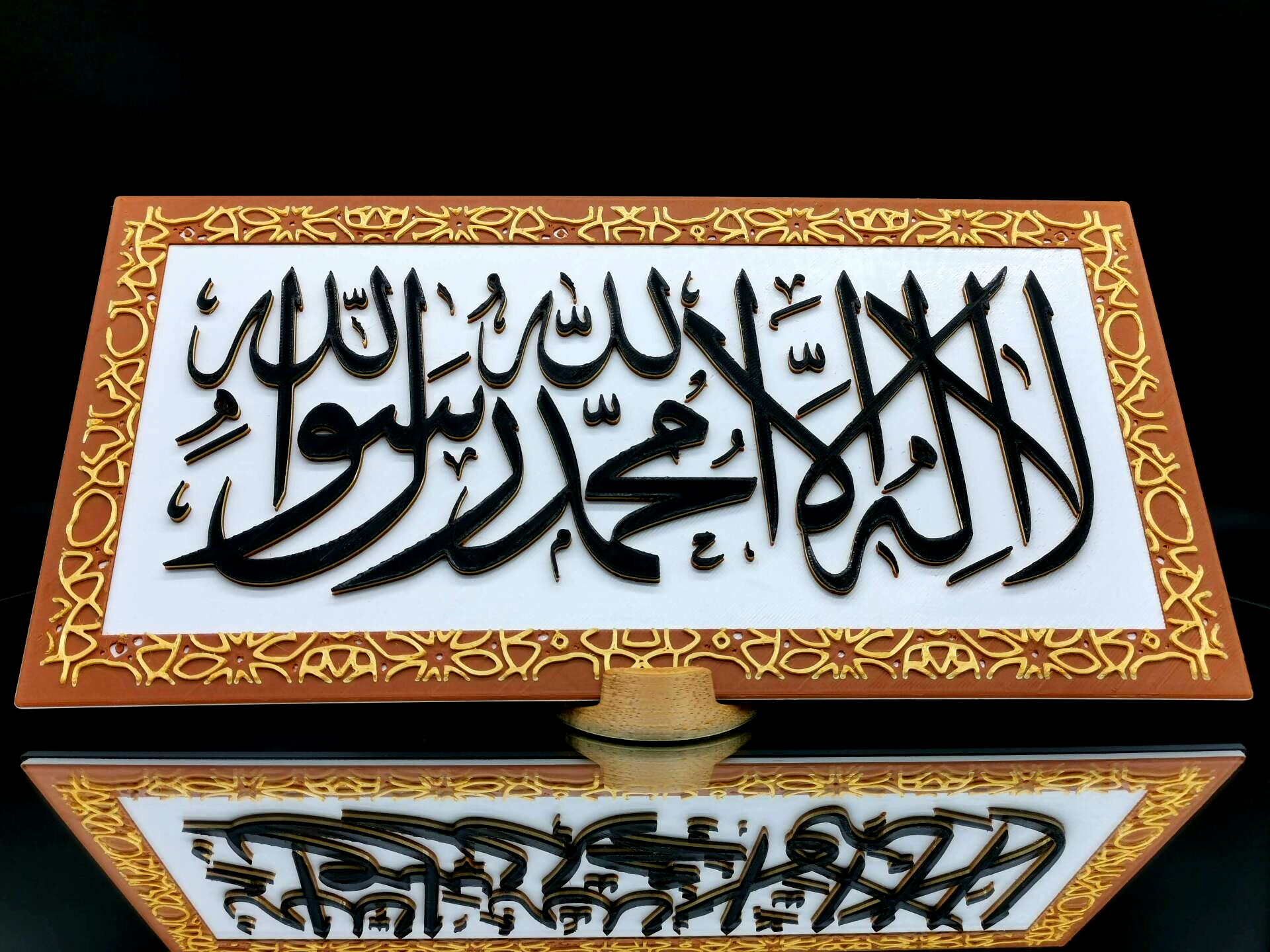 Setting: Bespoke plaque with a Quranic verse scribed in Arabic calligraphy, decorated with an intricate redwood and gold border.