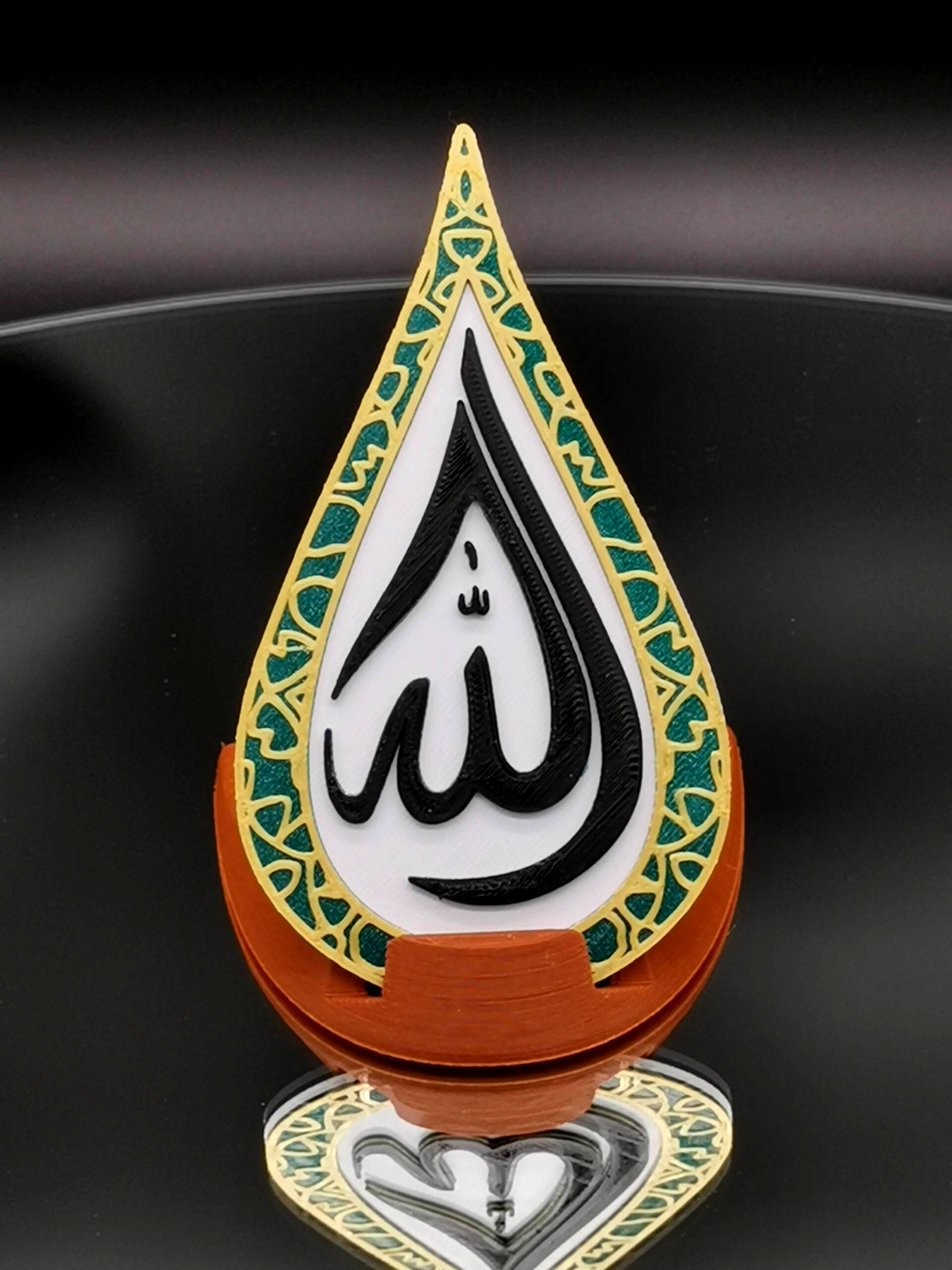 Setting: Bespoke teardrop-shaped plaque with "Allah" in Arabic calligraphy. Decorated with an intricate green and gold border.