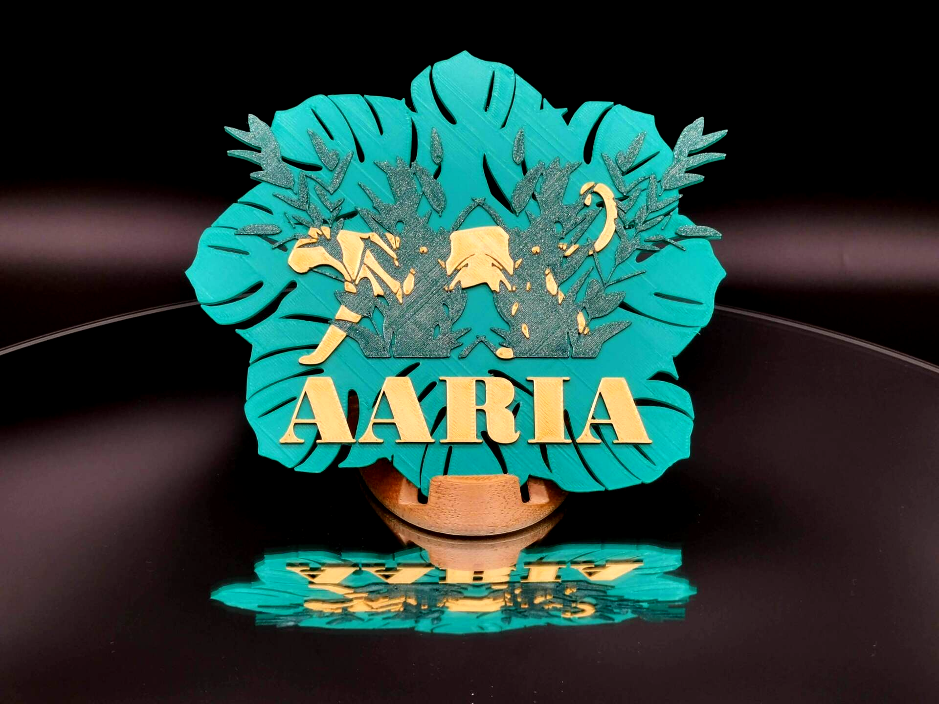 Setting: To celebrate our friends moving into their new home, we wanted to create a special gift for their little girl's bedroom. The family loves wildlife, rainforests and safaris, so we took inspiration from these themes and created this bespoke door sign. In a vibrant combination of forest green, glittery gold and mint green, this sign is sure to brighten up any door.